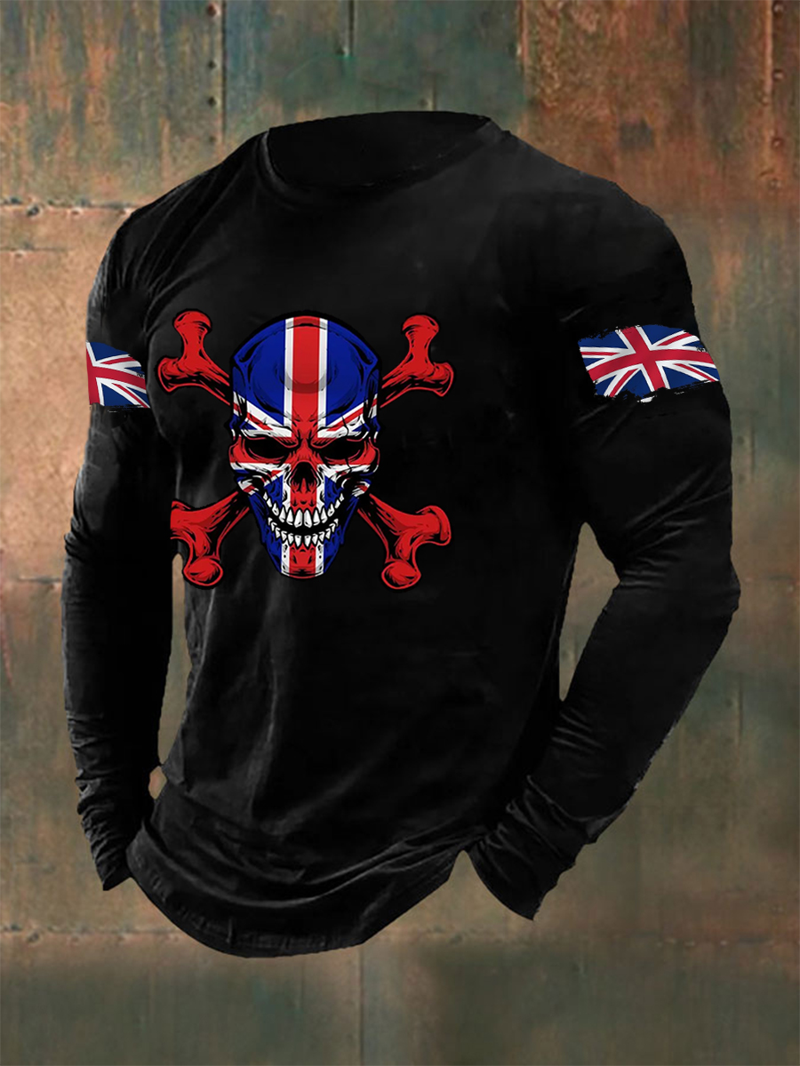 Men's UK Flag Skull Print Casual Long Sleeve T-Shirt